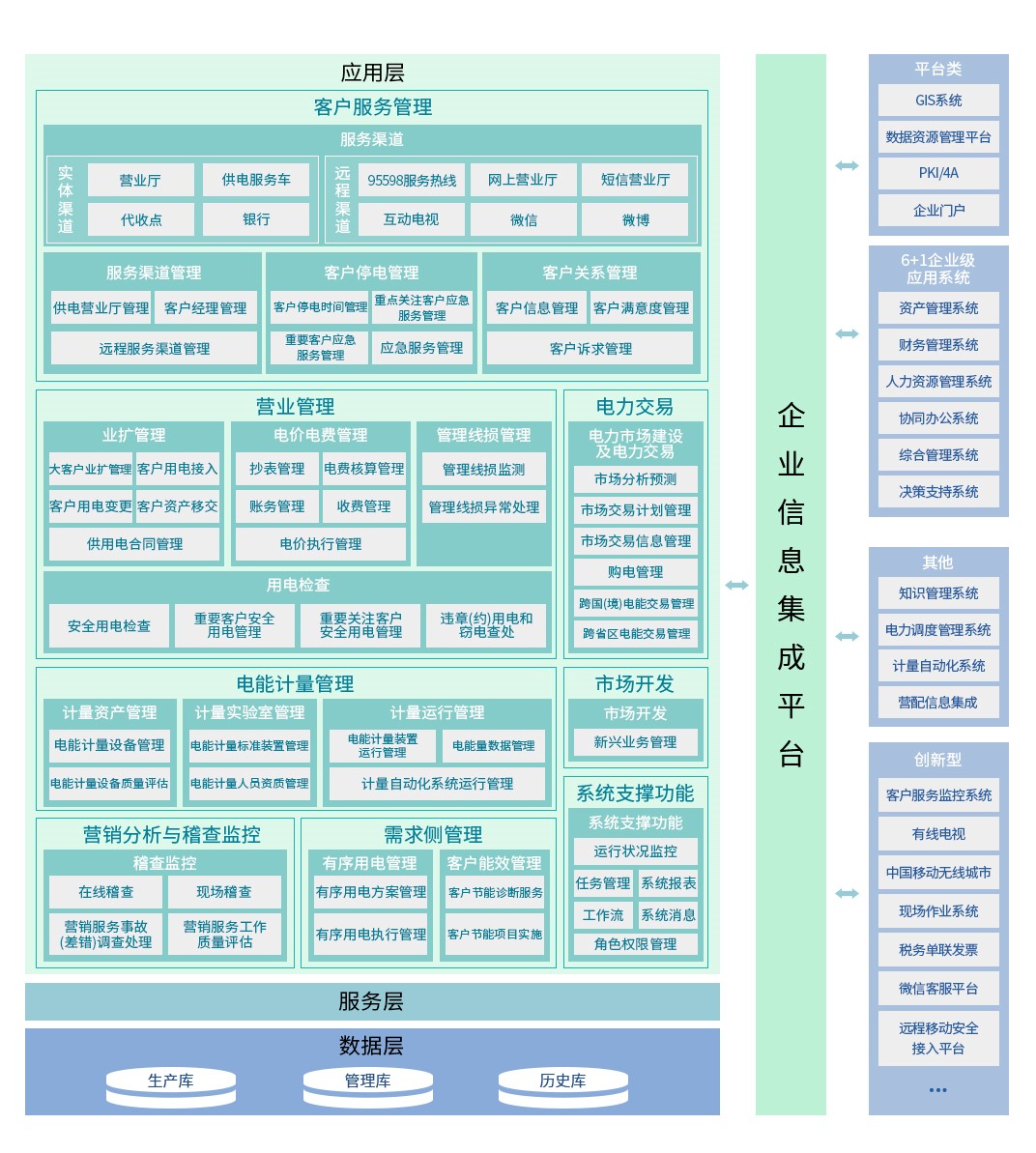 系统接纳了多层漫衍式系统架构和集群手艺,,,,优异支持了省级集中安排下的高并发会见及海量数据存储的要求;;;;;;基于SOA手艺,,,,系统实现了与财务、生产、物资、GIS、计量自动化等系统的横向融合;;;;;;系统还立异地接纳了客户-用电户-结算户三户模子,,,,彻底解决集团客户、业主与租户、合并及脱离缴费、通知、打印发票等电力营销疑难营业,,,,周全体现了“以客户为中心”的效劳理念。。。。