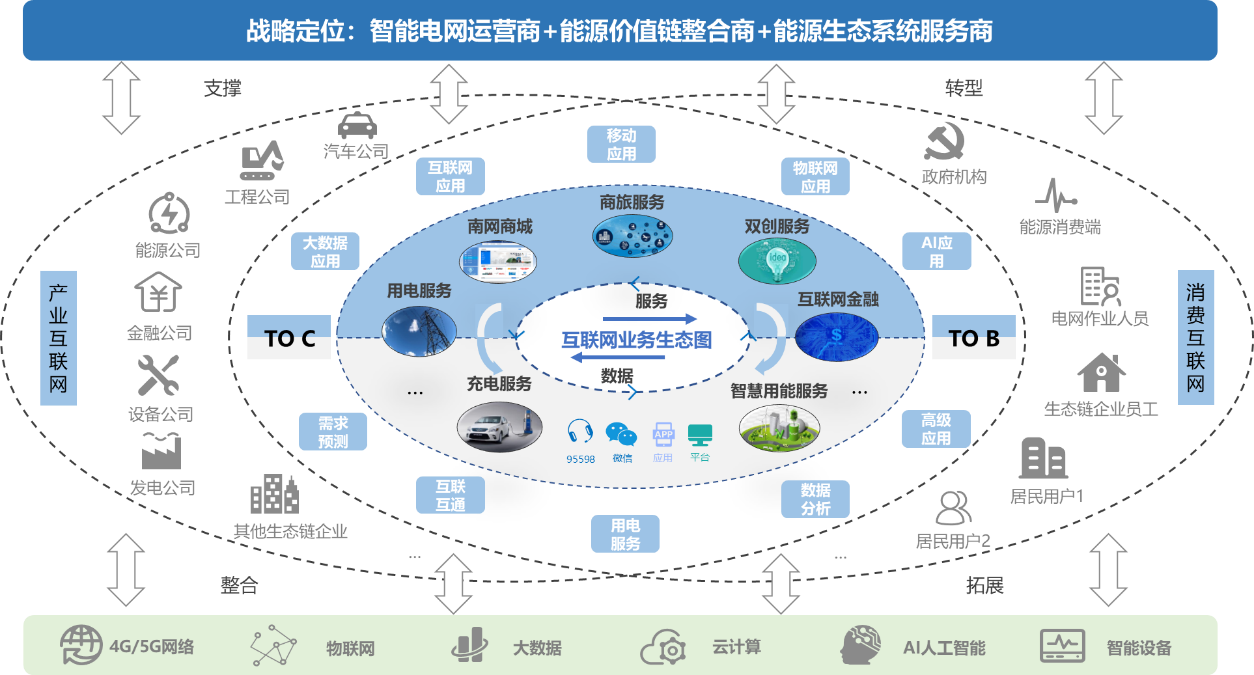 凭证“平台+生态”的思绪,,,实现对互联网公司营业生态系统的“引流+赋能”,,,以“互联网+能源互动效劳”为中心,,,向工业互联网和消耗互联网两头延伸价值链,,,实现生态链同伴在装备、市场、数据、效劳等要素的互联互通、协同生长,,,构建互利共赢的互联网营业新生态。。。。。。